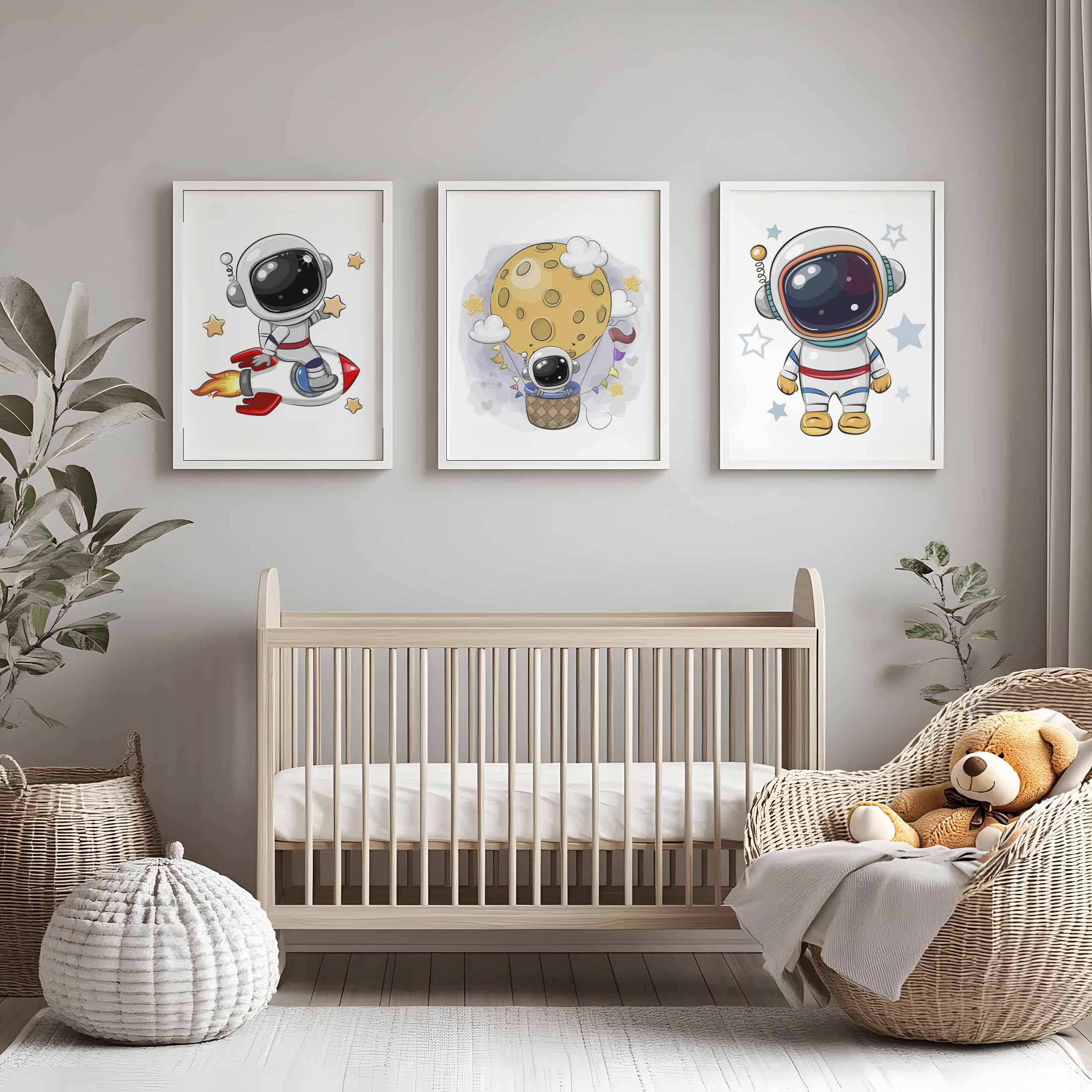 Quadro Decorativo Astronauta Foguete Lua Estrelas Kit 3 Quadros