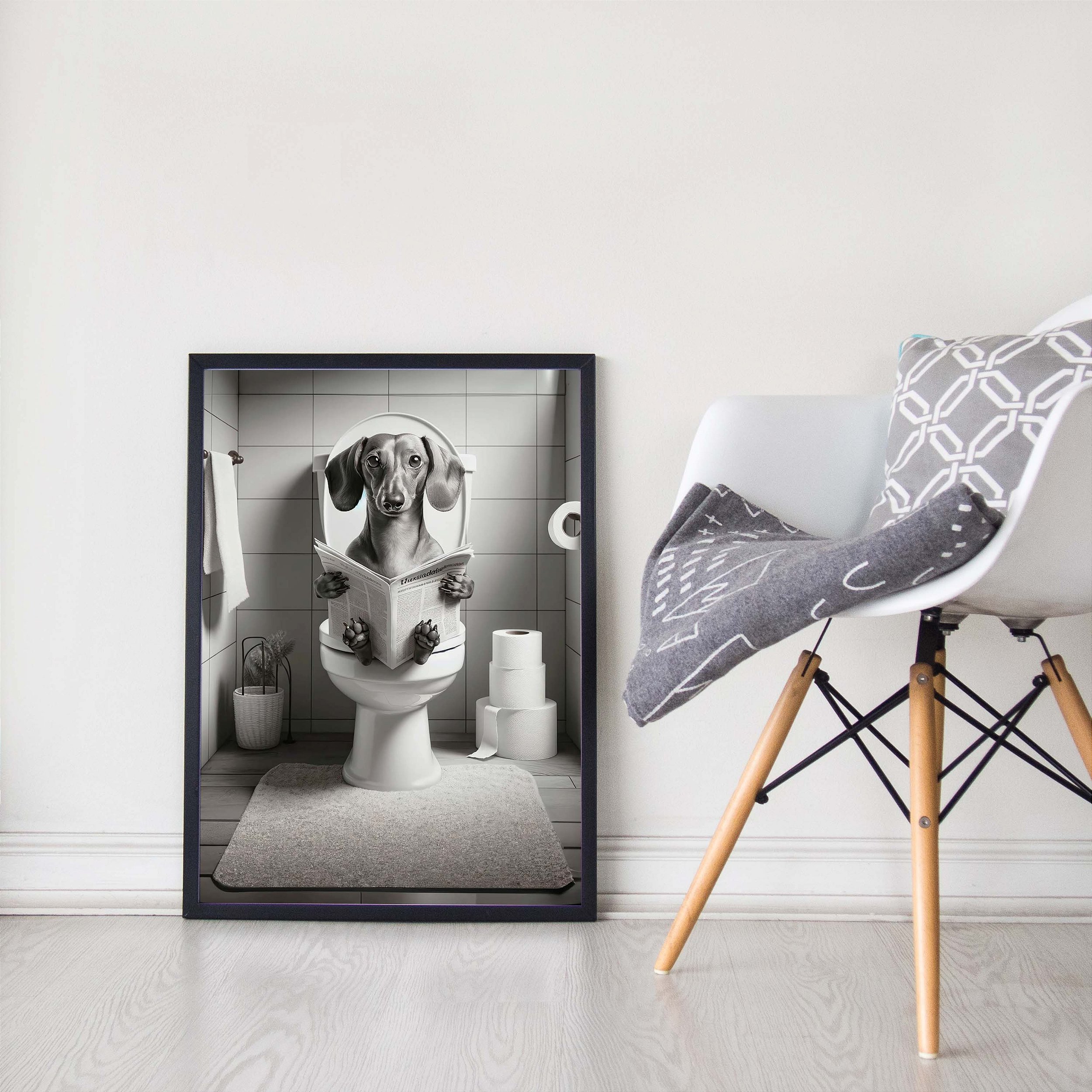 Quadro Decorativo Cachorro Dachshund Bathroom Lendo Jornal Banheiro