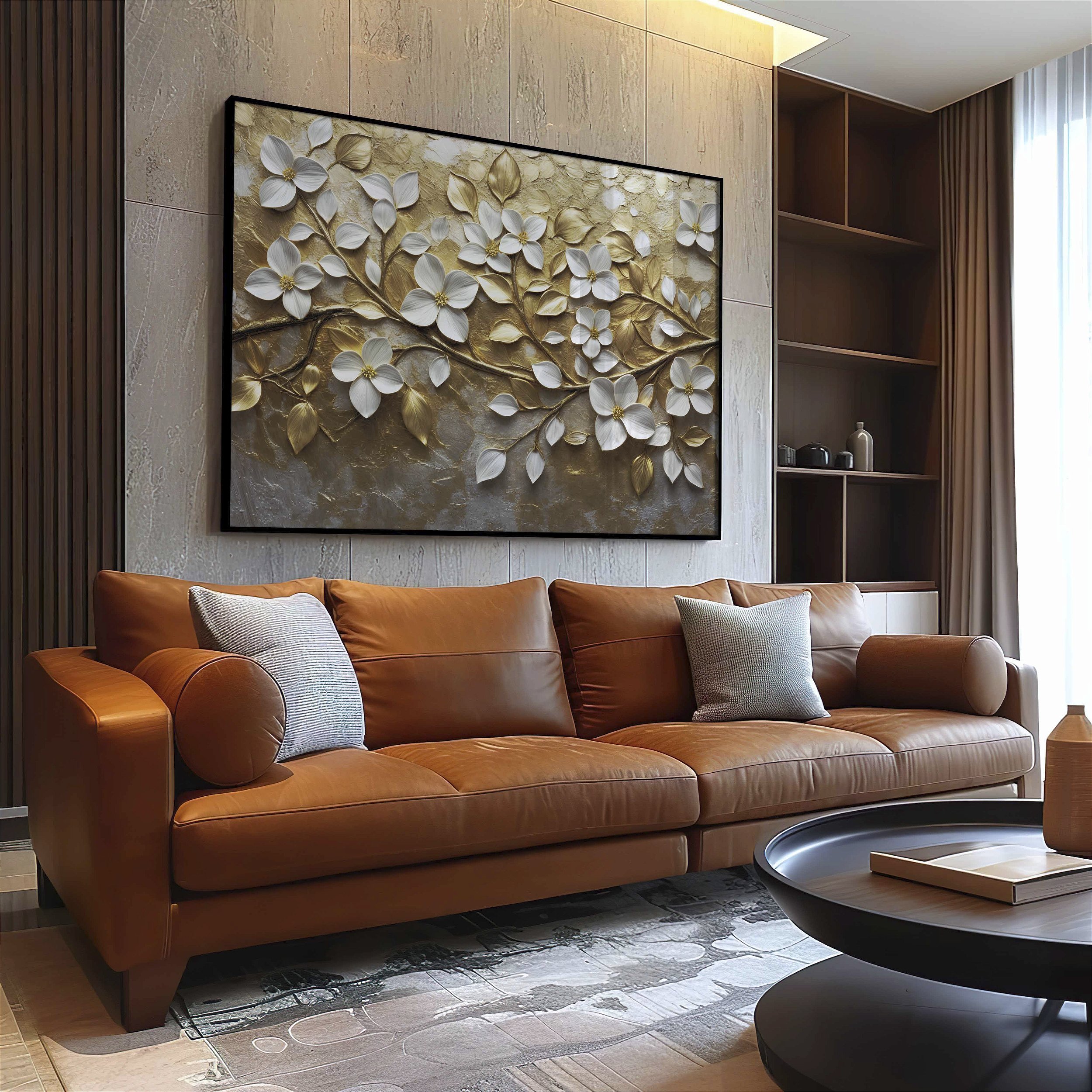 Quadro Decorativo Flores Branca Douradas Delicadas Galho Natureza
